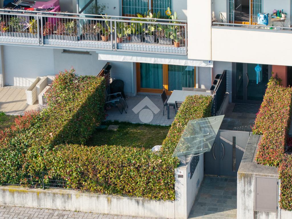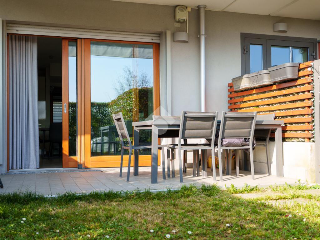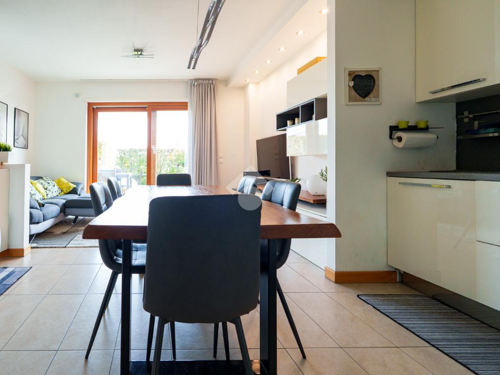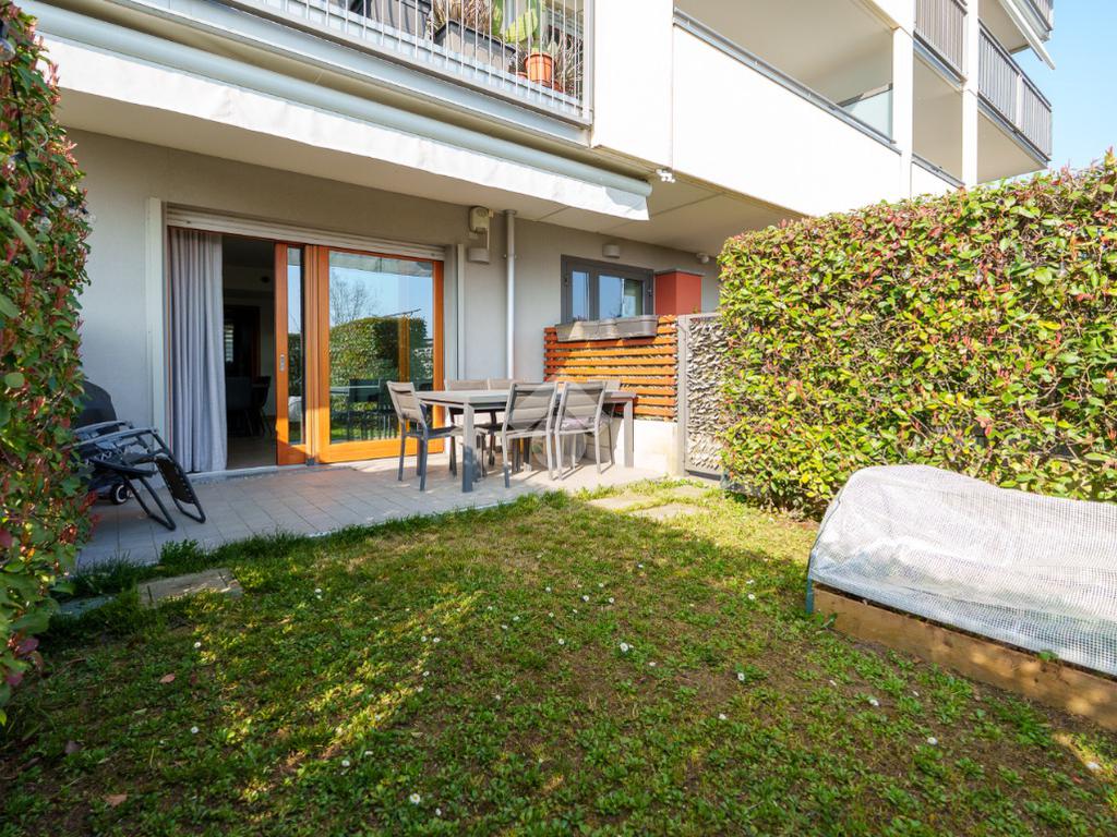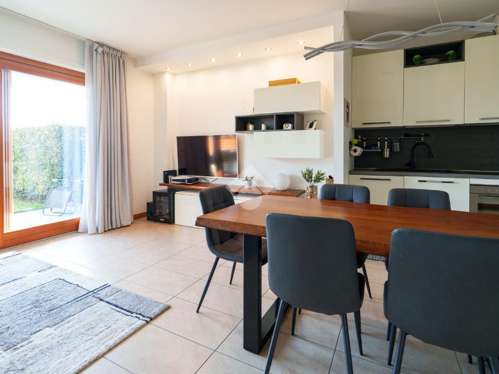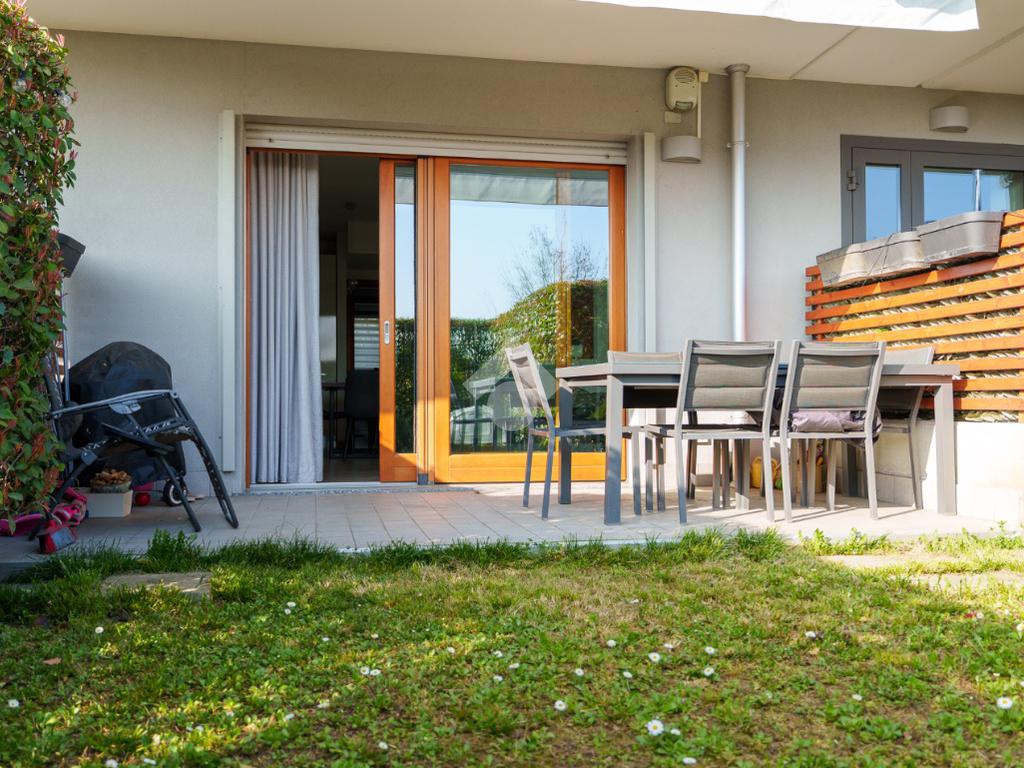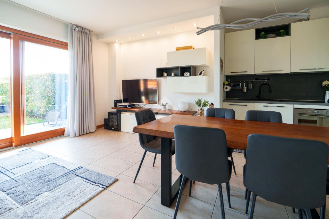 L'immobile, costruito nel 2014, offre un soggiorno accogliente con cucina a vista, bagno di servizio e giaridno, perfetto per momenti conviviali. La zona notte è caratterizzata da un elegante parquet e comprende una camera matrimoniale e una cameretta, entrambe affacciate su un secondo giardino privato, garantendo tranquillità e privacy. Secondo bagno principale presente nella zona notte.
