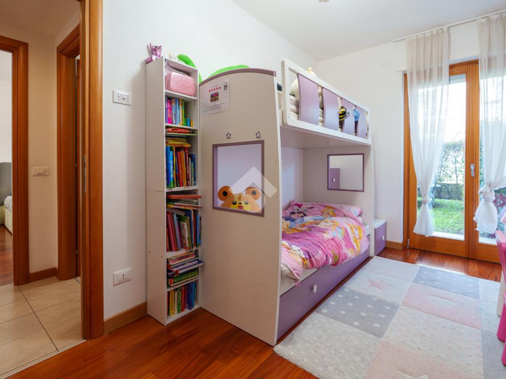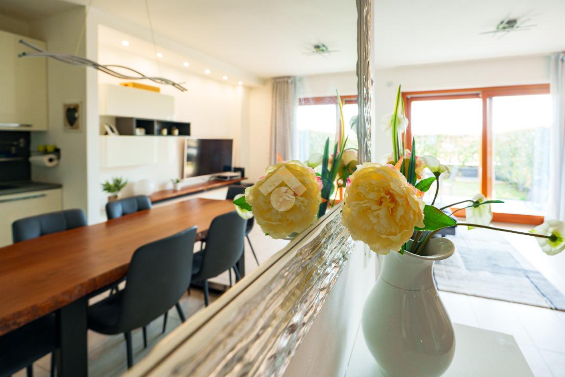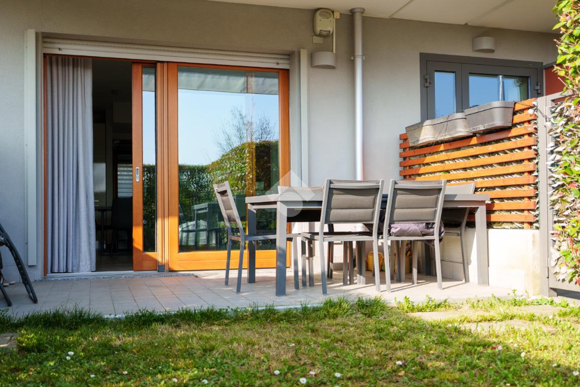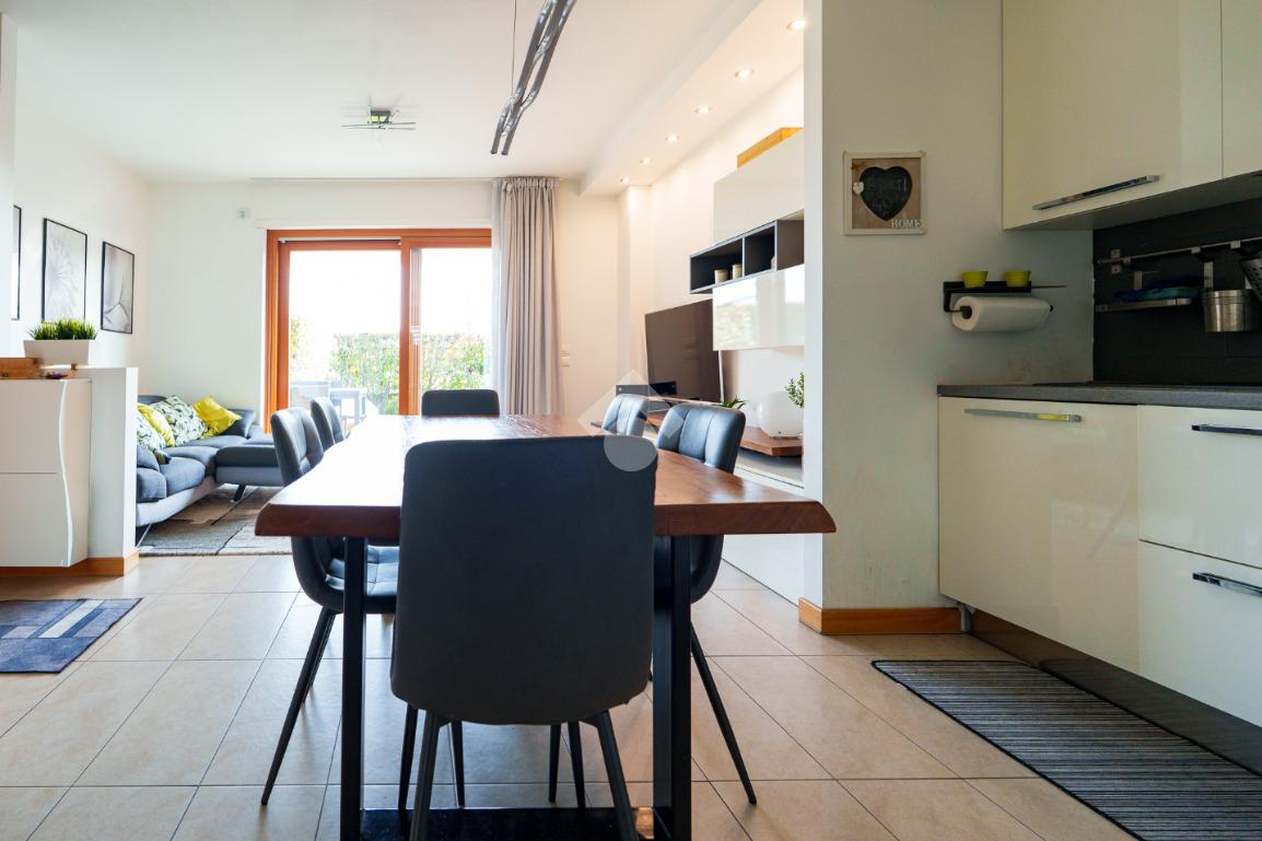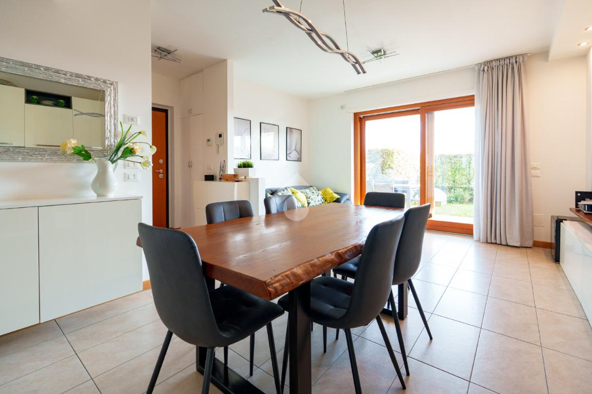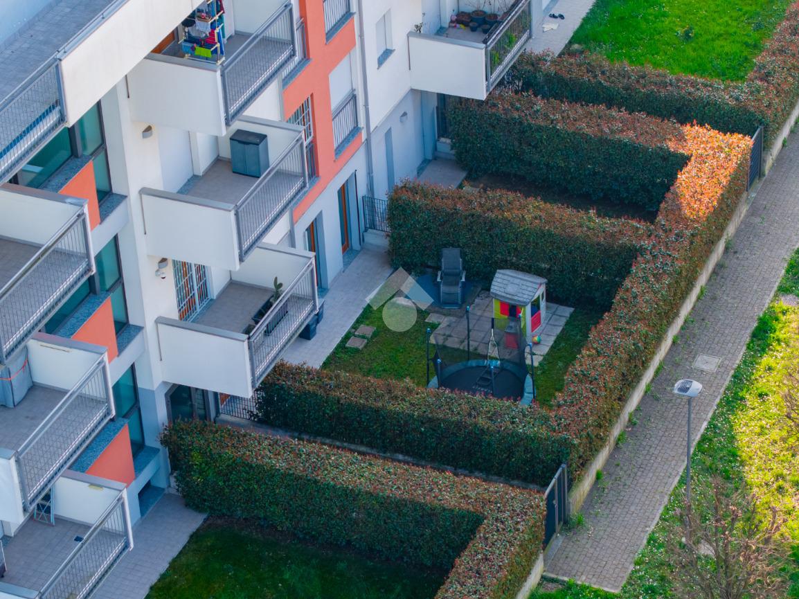L'immobile, costruito nel 2014, offre un soggiorno accogliente con cucina a vista, bagno di servizio e giaridno, perfetto per momenti conviviali. La zona notte è caratterizzata da un elegante parquet e comprende una camera matrimoniale e una cameretta, entrambe affacciate su un secondo giardino privato, garantendo tranquillità e privacy. Secondo bagno principale presente nella zona notte.