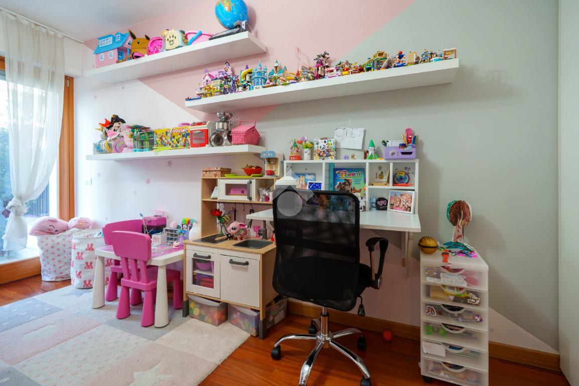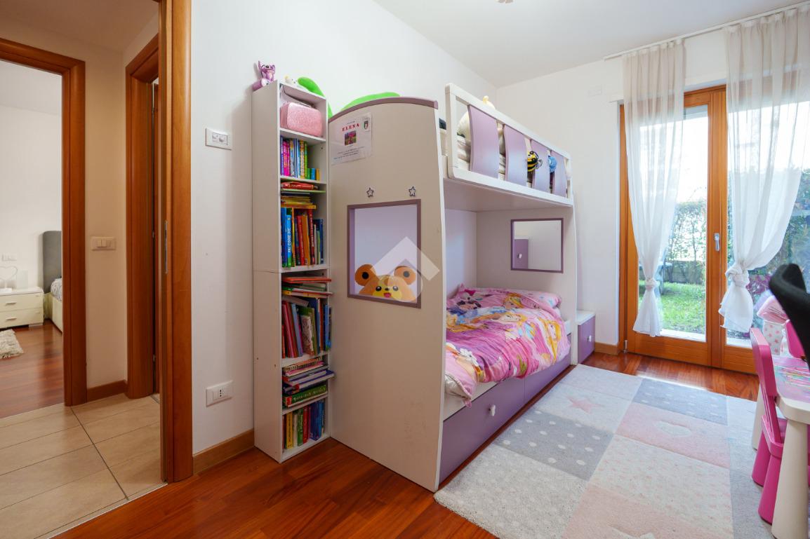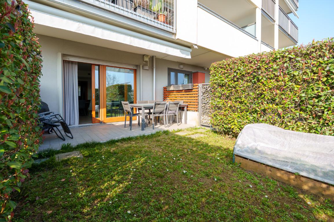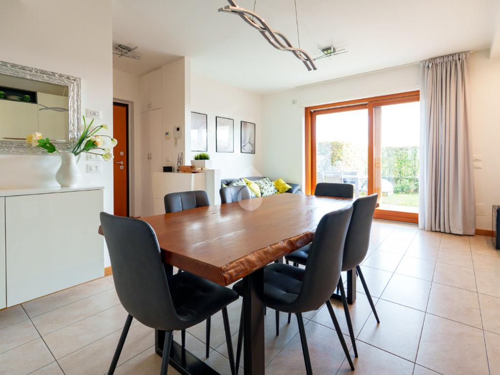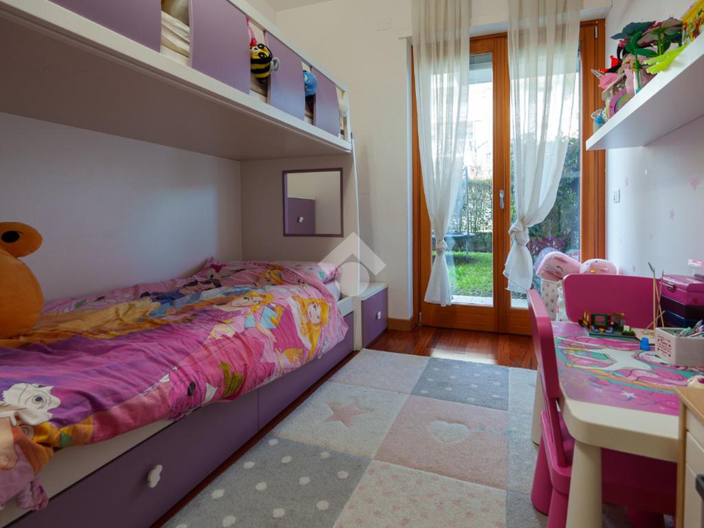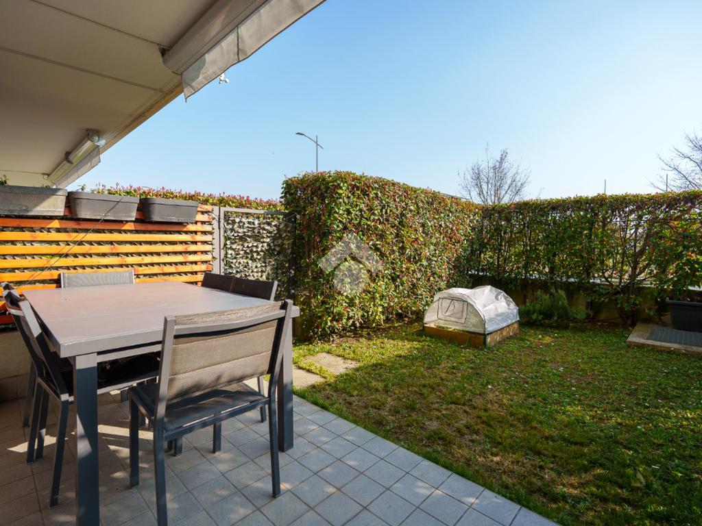 L'immobile, costruito nel 2014, offre un soggiorno accogliente con cucina a vista, bagno di servizio e giaridno, perfetto per momenti conviviali. La zona notte è caratterizzata da un elegante parquet e comprende una camera matrimoniale e una cameretta, entrambe affacciate su un secondo giardino privato, garantendo tranquillità e privacy. Secondo bagno principale presente nella zona notte.
